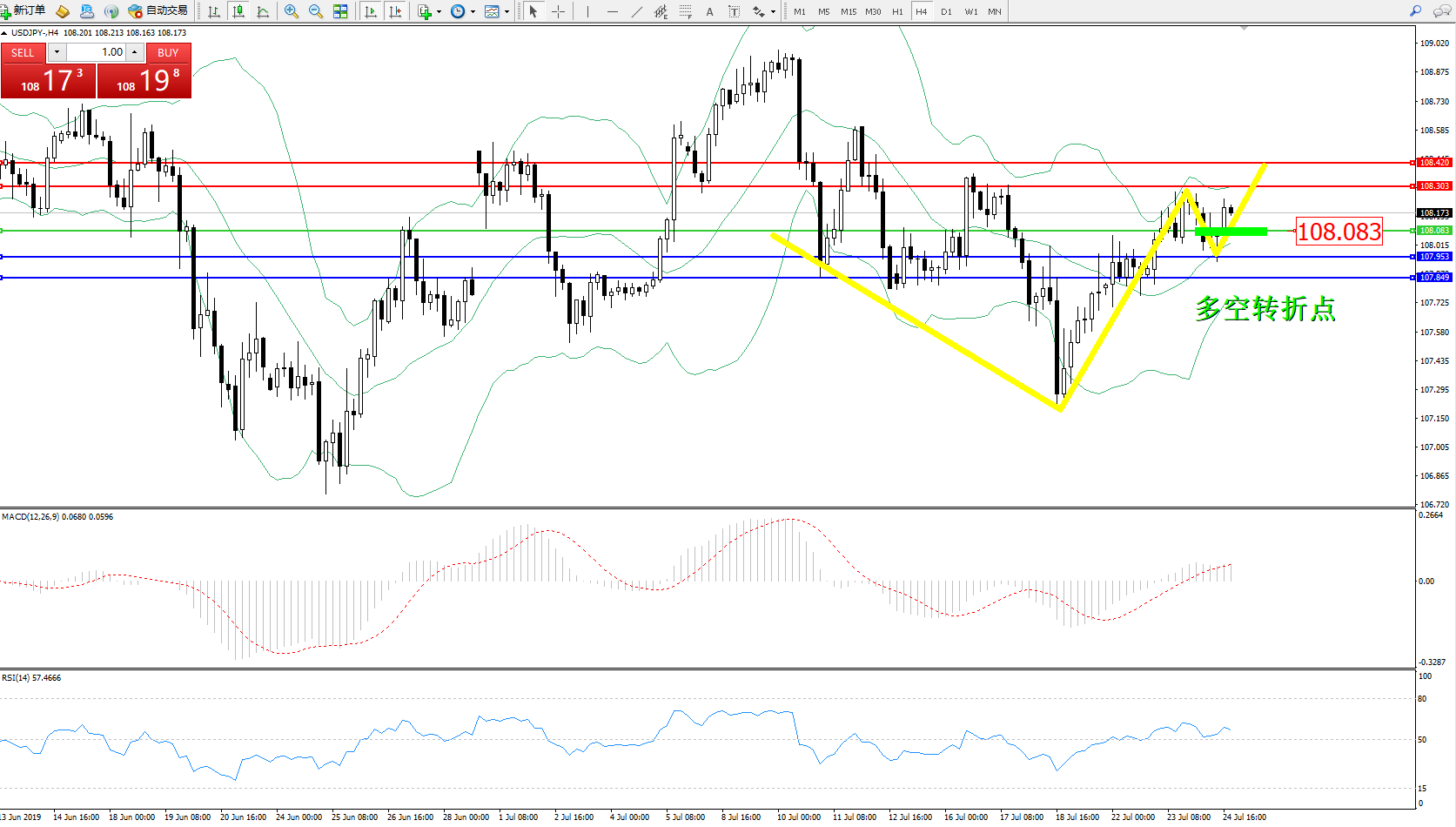 美日V型反转上行,尽管美元表现强势,但日内对全球经济衰退的担忧,加上法德及欧元区PMI数据不及预期,令避险日元受宠。英国新首相带来的无序脱欧预期也提振了避险资产,随着内阁成员逐渐确定,市场将转向英国能否在1031日之前顺利脱欧。