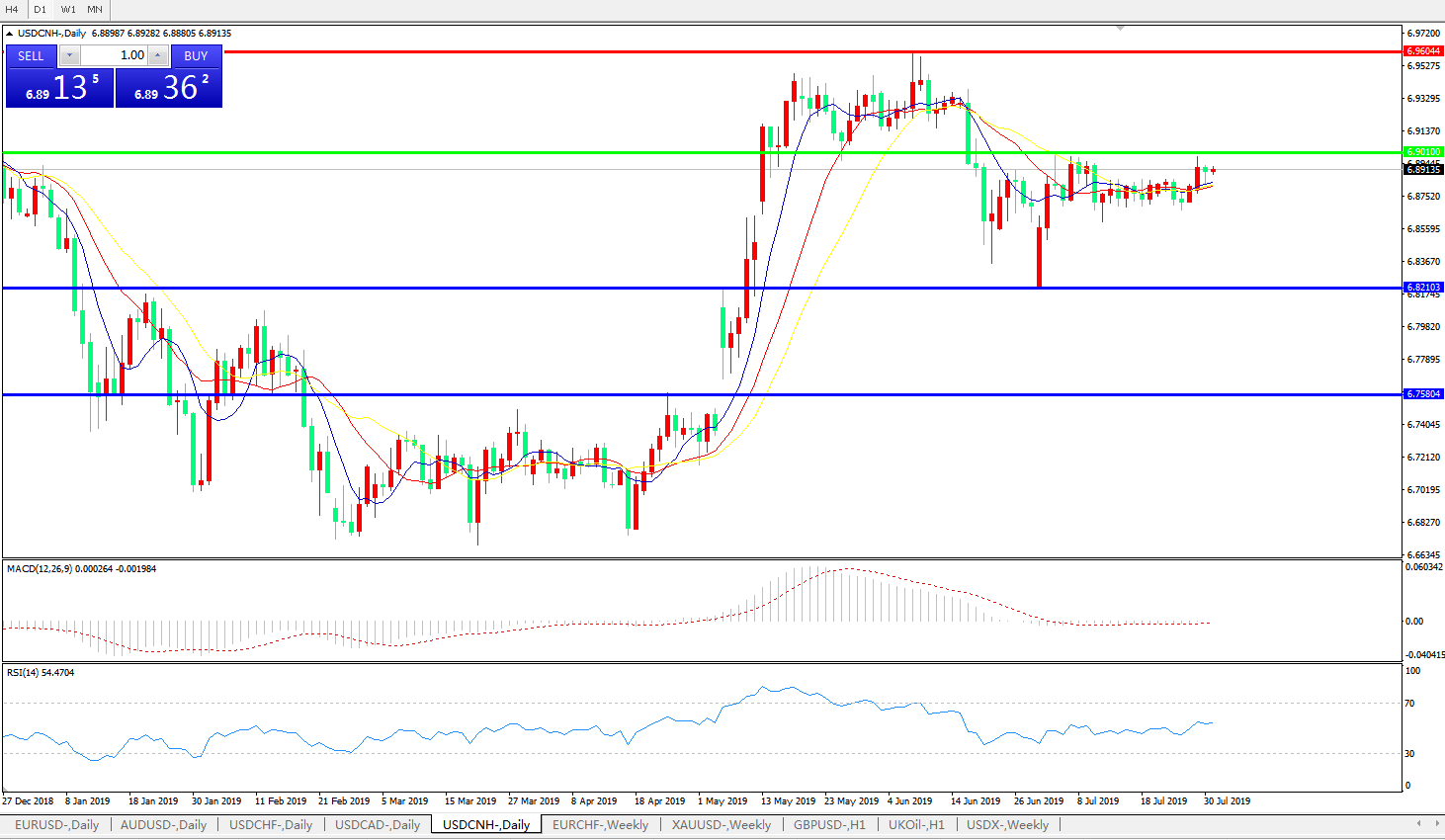 交易策略: 在6.9010之下,看跌,目标价位为6.8210,然后为6.7580。