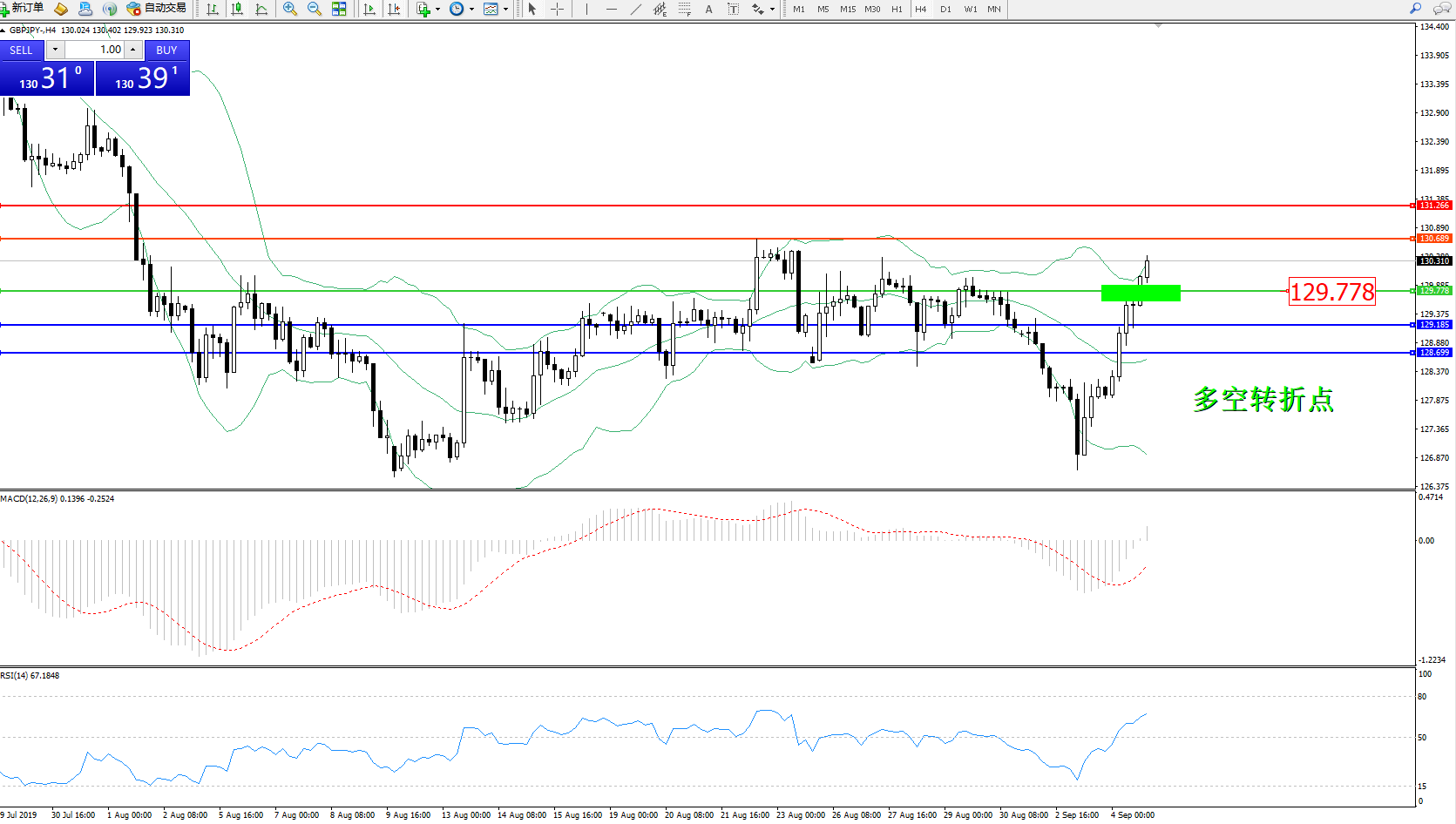 交易策略:129.778下方看跌,目标129.185128.699