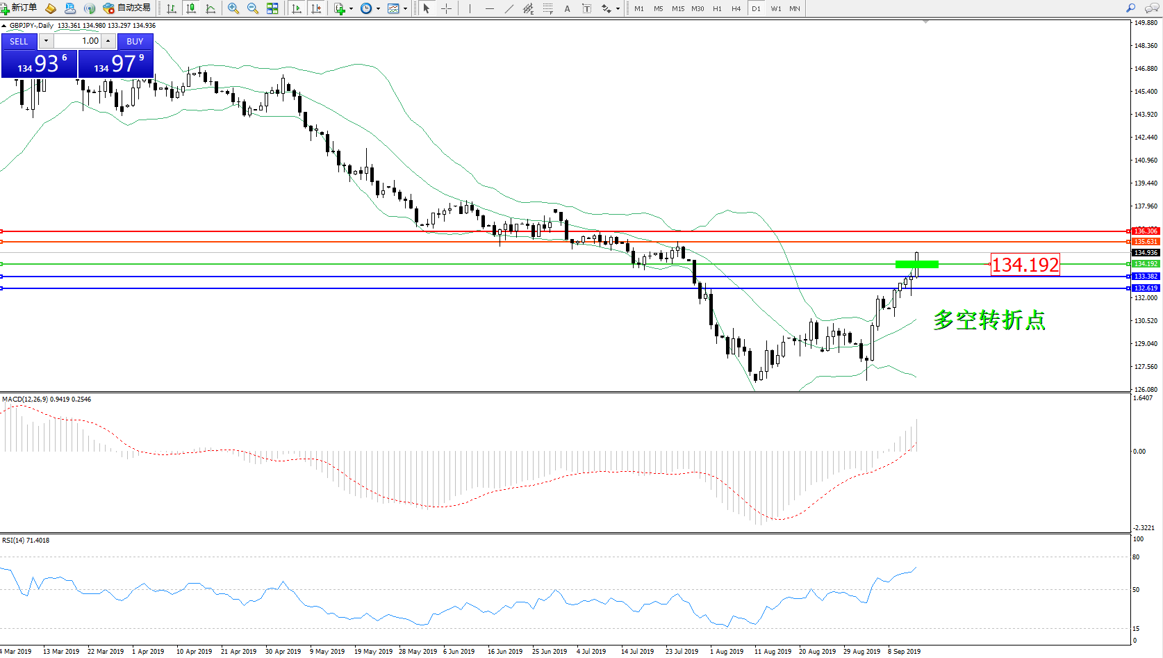 交易策略:134.192上方看涨,目标135.631、136.306