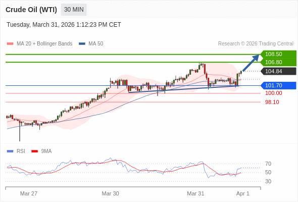 在 101.70 之上,看涨,目标价位为 106.80 ,然后为 108.50 。