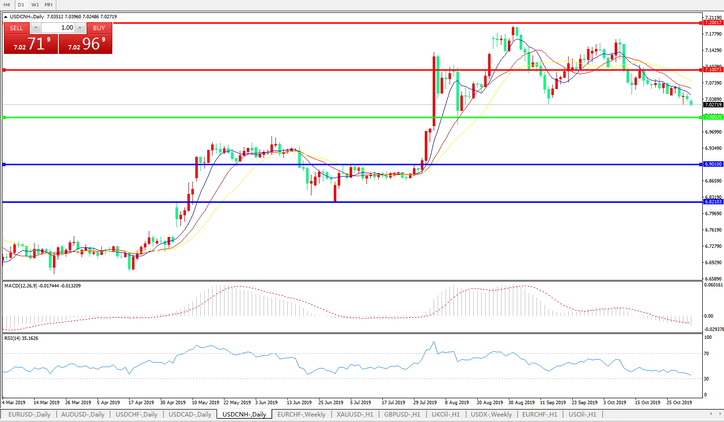 技术面简析:日图均线呈空头排列,汇价缓步走低,MACD下穿0轴且量能0轴下方持续小幅放量,RSI持续走低,预计短期汇价大概率将进一步下行,汇价持续运行于7.00-7.10区间的概率较大;重点关注中美贸易谈判最新进展。