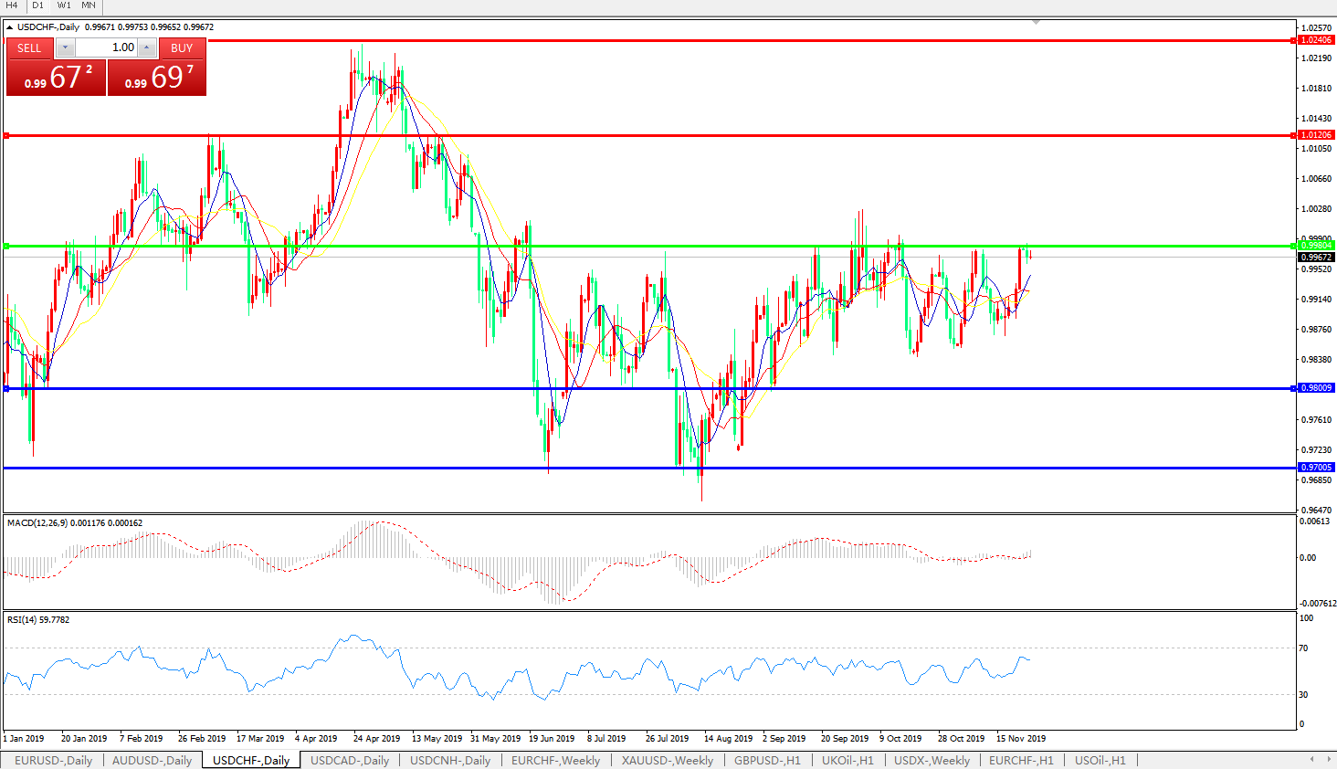 美元兑瑞郎在周一延续高位盘整行情,亚洲时段小幅回吐上周五涨幅,跌至日低0.9965,但在欧洲时段重新走强,触及0.9985这一1016日以来的五周半新高。主要是受到了全球风险情绪重新转暖和美元走强的带动; 上周五美国经济数据整体向好的走势带动美元指数重上98关口,周一日内美指继续在高温盘整,与此同时,周末国际贸易方式再度传出利好消息,也推动了全球风险情绪转暖,对于瑞郎这样的避险货币而言是额外的打压,令 其与现货黄金和日元等避险资产联手走低; 在此状况下,美元兑瑞郎汇价重新逼近平价关口,但在贸易局势尚欠“临门一脚”的背景下,上破1.00关口的动能仍旧受限,市场本周仍将关注贸易领域的进一步动向。同时,本周后半段美国迎来感恩节假期,汇市交投清淡期间波动幅度可能扩大,须对此格外留意