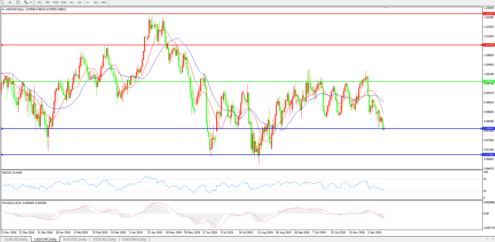 技术面简析:日线图均线呈有序空头排列,汇价再度下行试探0.98关口支撑,MACD运行于0轴下方且量能0轴下持续放量,RSI震荡走低,预计汇价存进一步下行空间。