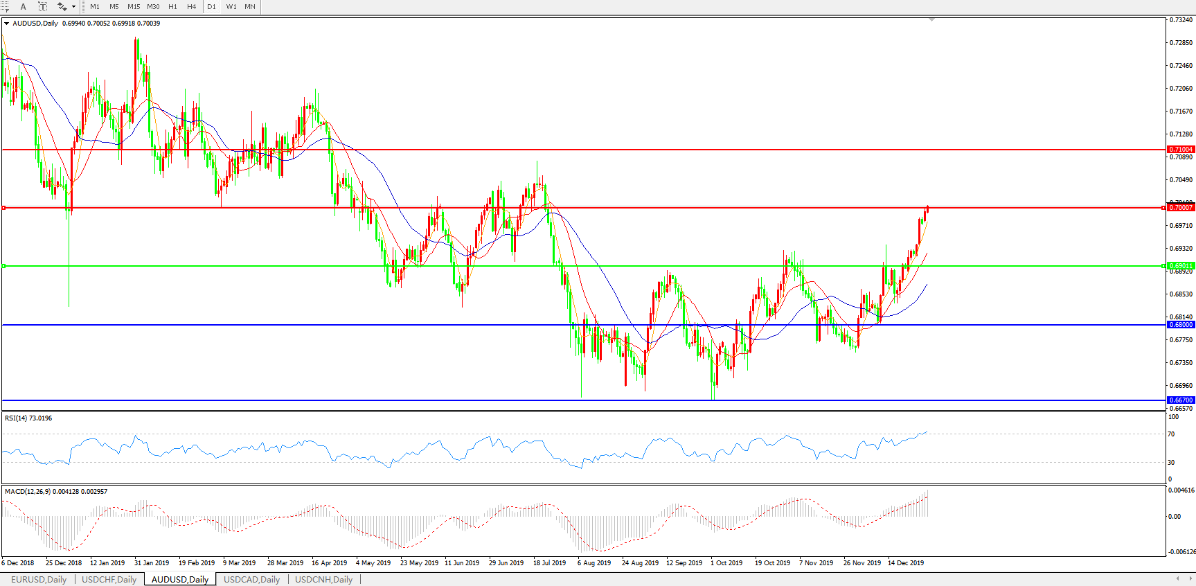 技术面简析:日图均线整体呈多头排列,汇价持续大幅度上攻冲击0.70关口压制,MACD继续上攻且量能快速放量,RSI走高进入超卖区域,短线关注0.70关口的争夺,预计汇价大概率将进一步走高。
