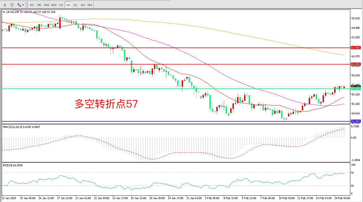 4小时图看,布油震荡企稳,底部形态初现,57美金成为多空分水岭,整体走势有回暖迹象,短期均线拐头向上,MACD红柱增加,RSI指标走平,日内震荡上行概率较大。