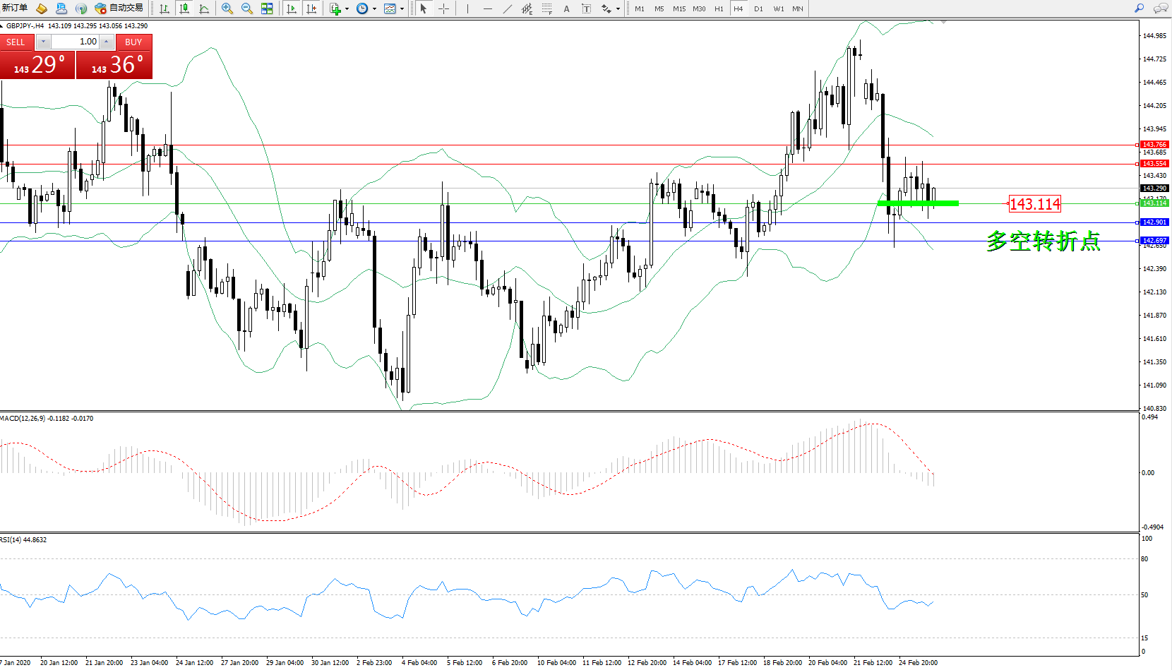 备选策略:143.114下方看跌,目标142.901、142.697