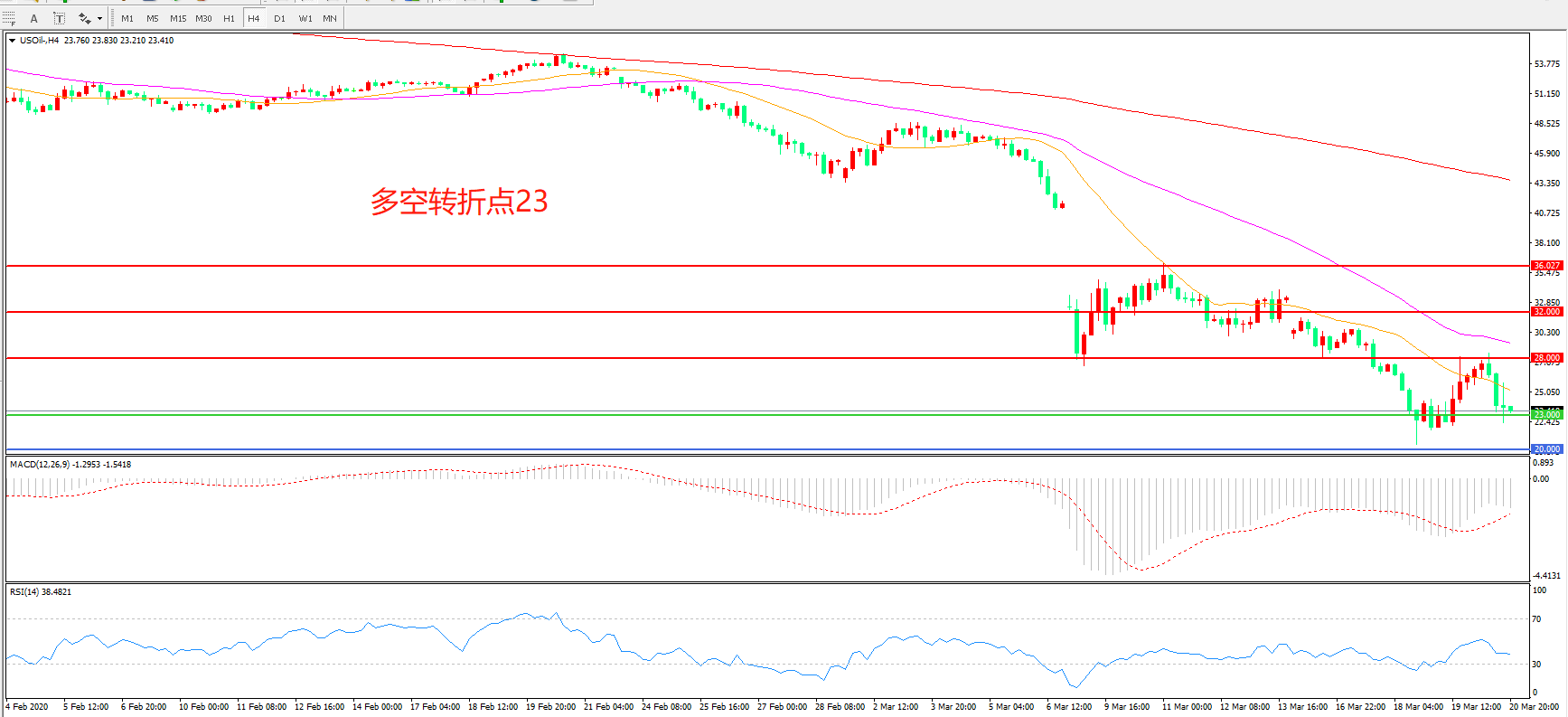 交易策略:在23.00之下看跌,目标20.00        18.00