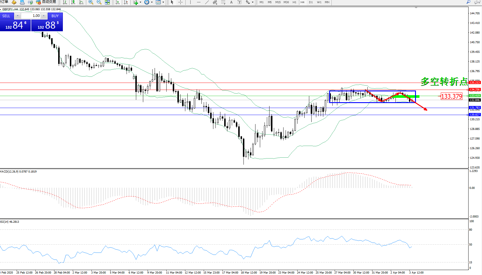 交易策略:133.379下方看跌,目标131.783130.827
