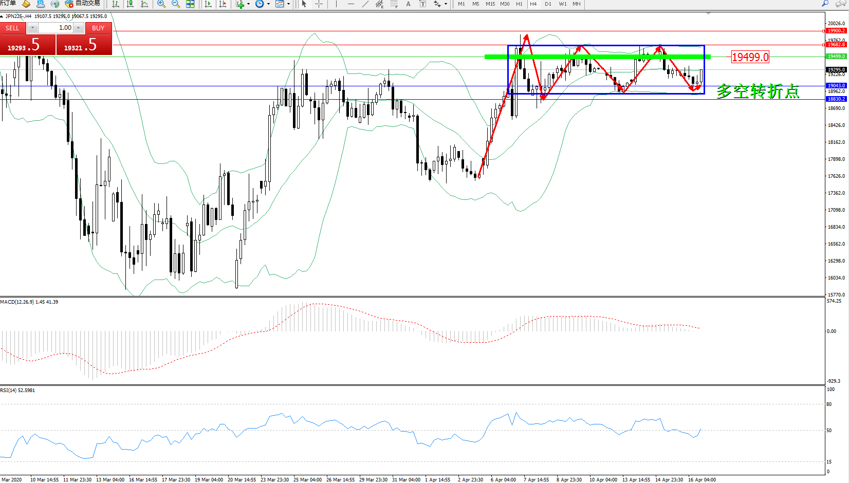 日经指数JPN225——4小时K线图显示: