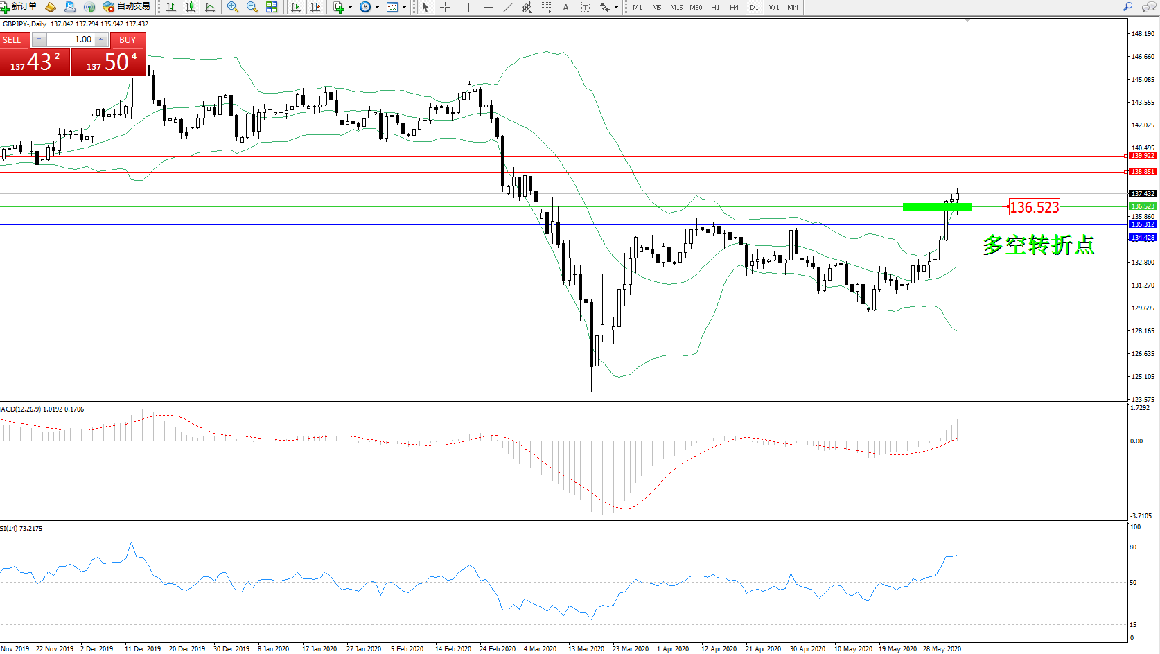交易策略:136.523上方看涨,目标138.851139.922