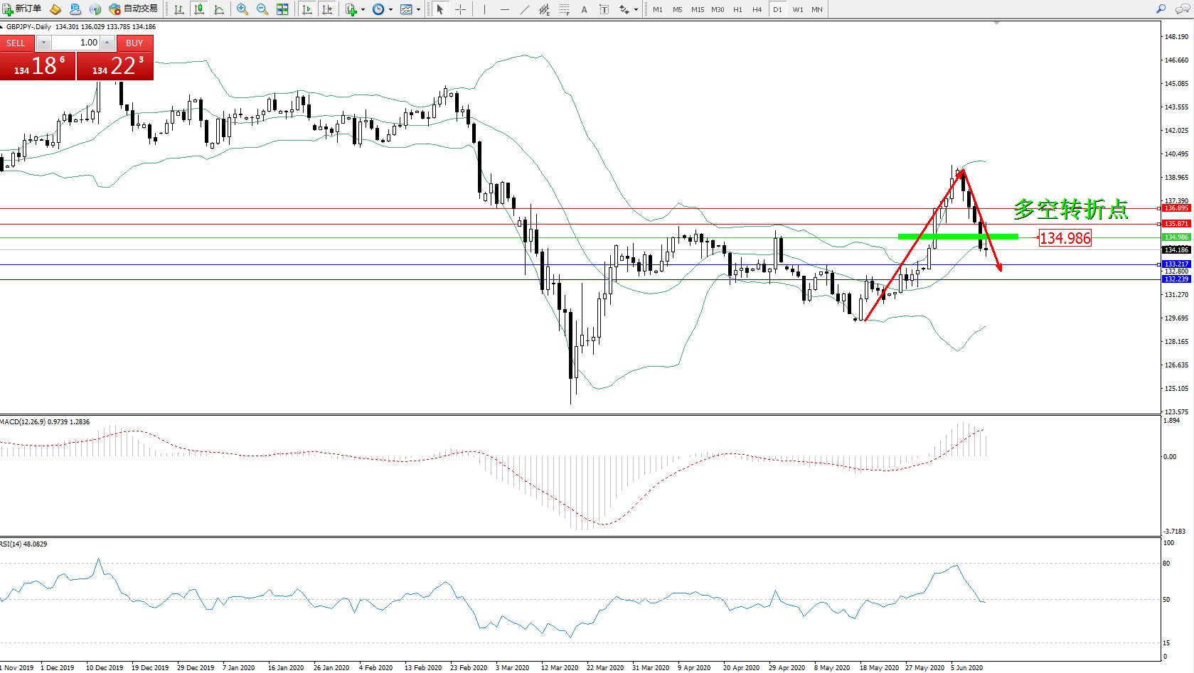 交易策略:134.986下方看跌,目标133.217132.239