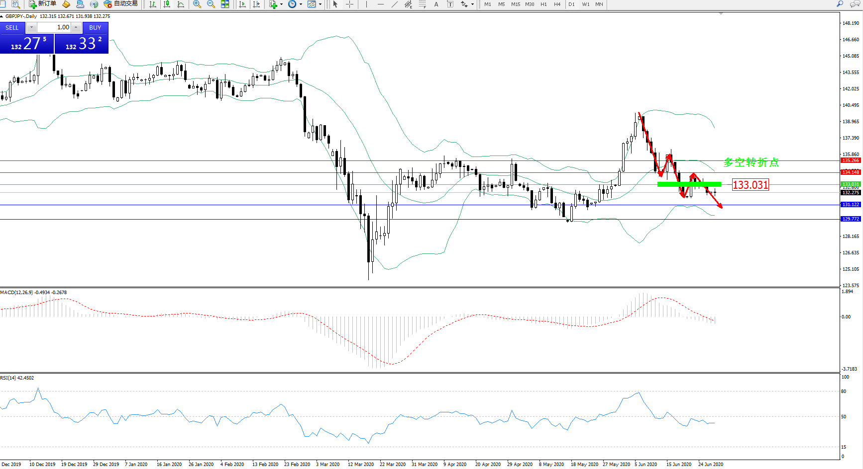 交易策略:133.031下方看跌,目标131.122、129.772