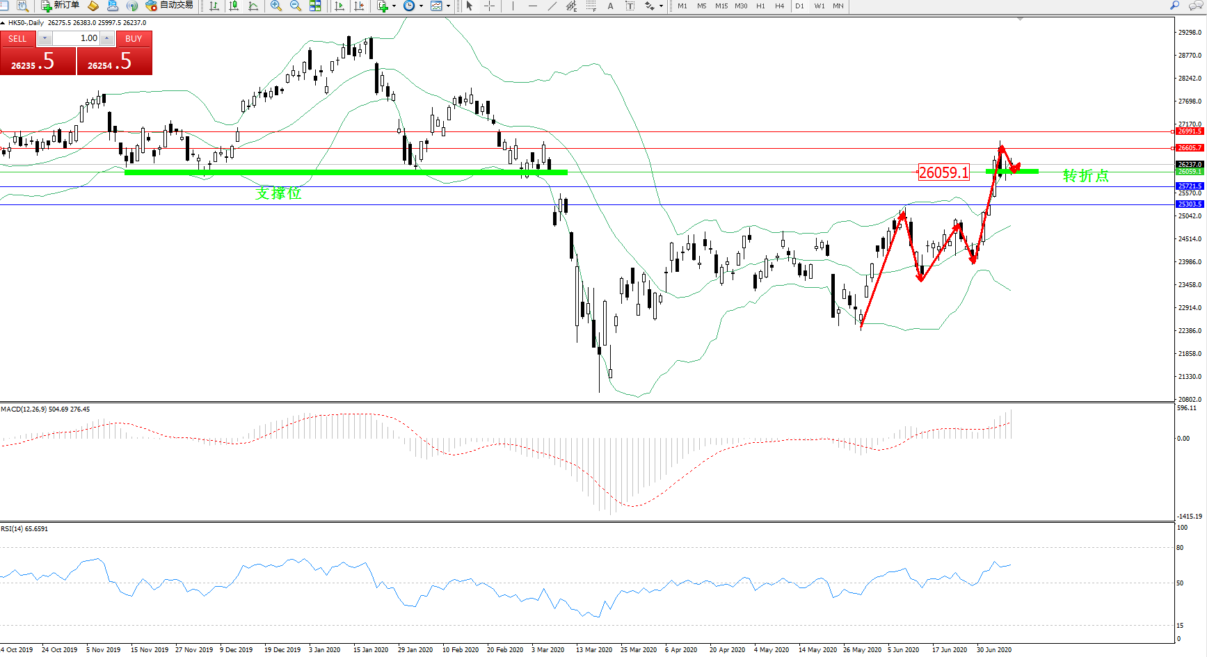 交易策略:26059上方看涨,目标26605、26991