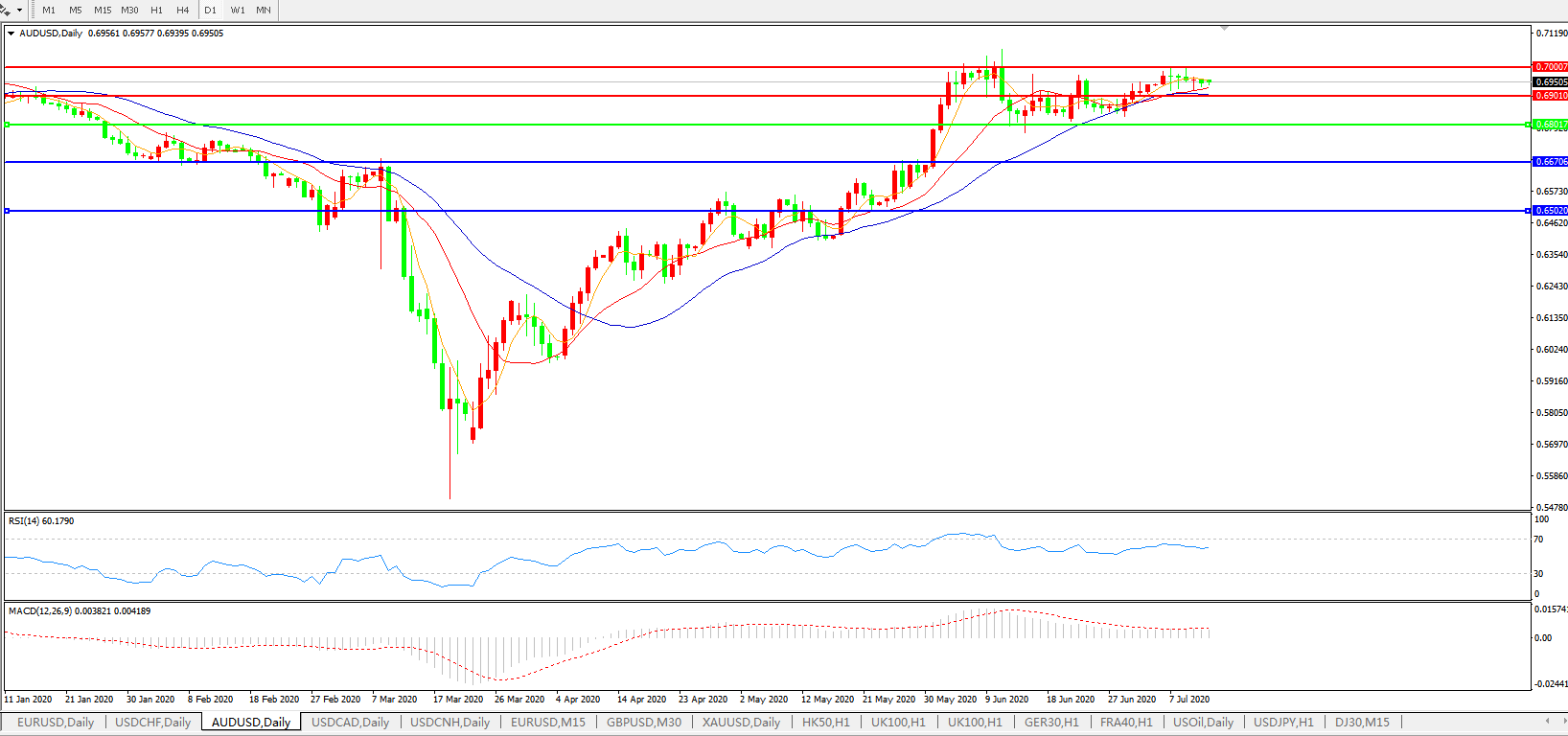 技术面简析:日图均线维持发散上行态势,汇价小幅回落整理,MACD运行于0轴上方但量小幅缩量,RSI缓步走弱,预计汇价短线大概率将继续整理,关注0.7000 关口压制。