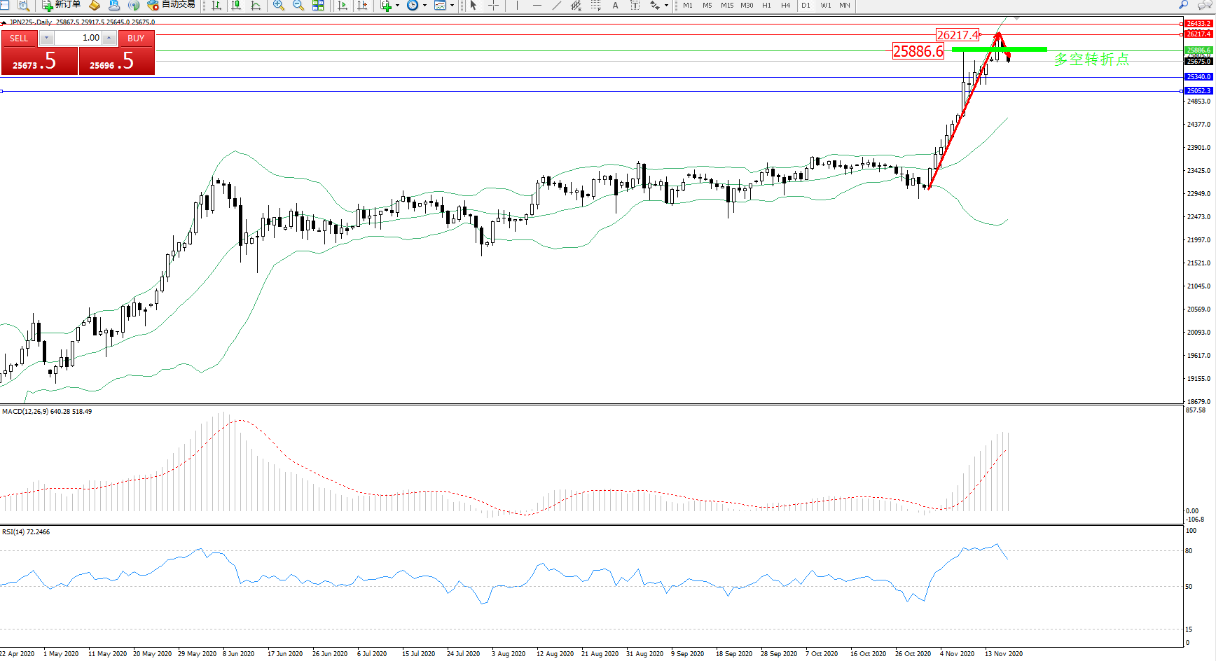 日经225指数11月18日(周三)收盘下跌267.12点,跌幅1.03%,报25747.50点。美国政局僵局仍在持续,隔夜美联储理事提名人谢尔顿遭参院表决否决的状况更凸显了政治恶斗的负面影响,资金因而进一步逃离美国市场,对于市场投资者而言,新冠病毒疫苗问世带来的远期利好,远远无法抵消当下美国政治危局和欧洲疫情大爆发带来的持续风险,新冠疫苗研发方面的最新消息可能打压避险需求,同时新冠病例加速增多和美元走弱又构成反向力量。新冠病例激增已导致美国住院率创纪录,当局开始对聚会实施新的限制;日本、韩国和澳洲爆发新疫情也令当局感到不安。