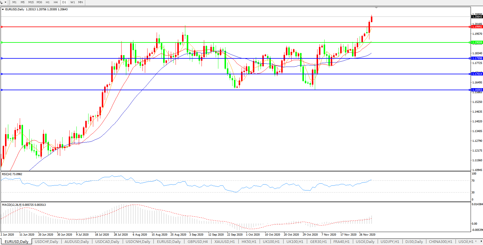 Tempus, Inc交易副总裁John Doyle说,交易员正在寻找一切理由来推高风险资产,而这是以美元为代价的,在希望破灭后,当有报导称两党仍有可能就刺激计划达成协议时,这是推高风险资产并卖出美元的又一个理由。对新冠病例上升的担忧挥之不去,并未给美元提供太多避险支撑。越来越多的人猜测,美联储将采取行动,在接种疫苗之前支撑经济度过一个艰难的冬天。这应该会进一步打压美元。美联储主席鲍威尔和财政部官员努钦周二敦促国会为小企业提供更多帮助,目前新冠疫情不断加剧,他们担心疫苗带来的缓解可能无法及时挽救这些企业免遭破产的命运。欧元兑美元盘中触及1.2077美元的两年半高位,尾盘上涨1.21%,报1.2071;加拿大丰业银行在一份研究报告中称,支持欧元在中短期进一步上涨的技术理由相当令人信服。11月价格走势总体对欧元有利,突破(下半月)盘整区间暗示欧元有升向1.25-1.26美元的潜力。。