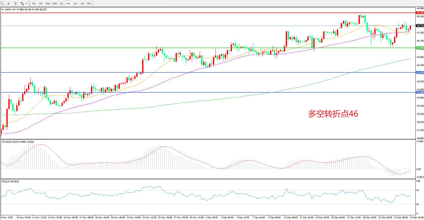 目前来看,原油市场中主要的利多作用有疫苗的预期以及美国纾困方案。目前,这两个因素都已经充分反映。因此,对于原油价格来说,似乎基本面和宏观面并不能指出明确的方向,至于价格是否会在技术面的层面走自然下落,则要等到圣诞假期之后,市场成交活跃在观察市场情绪的发酵。