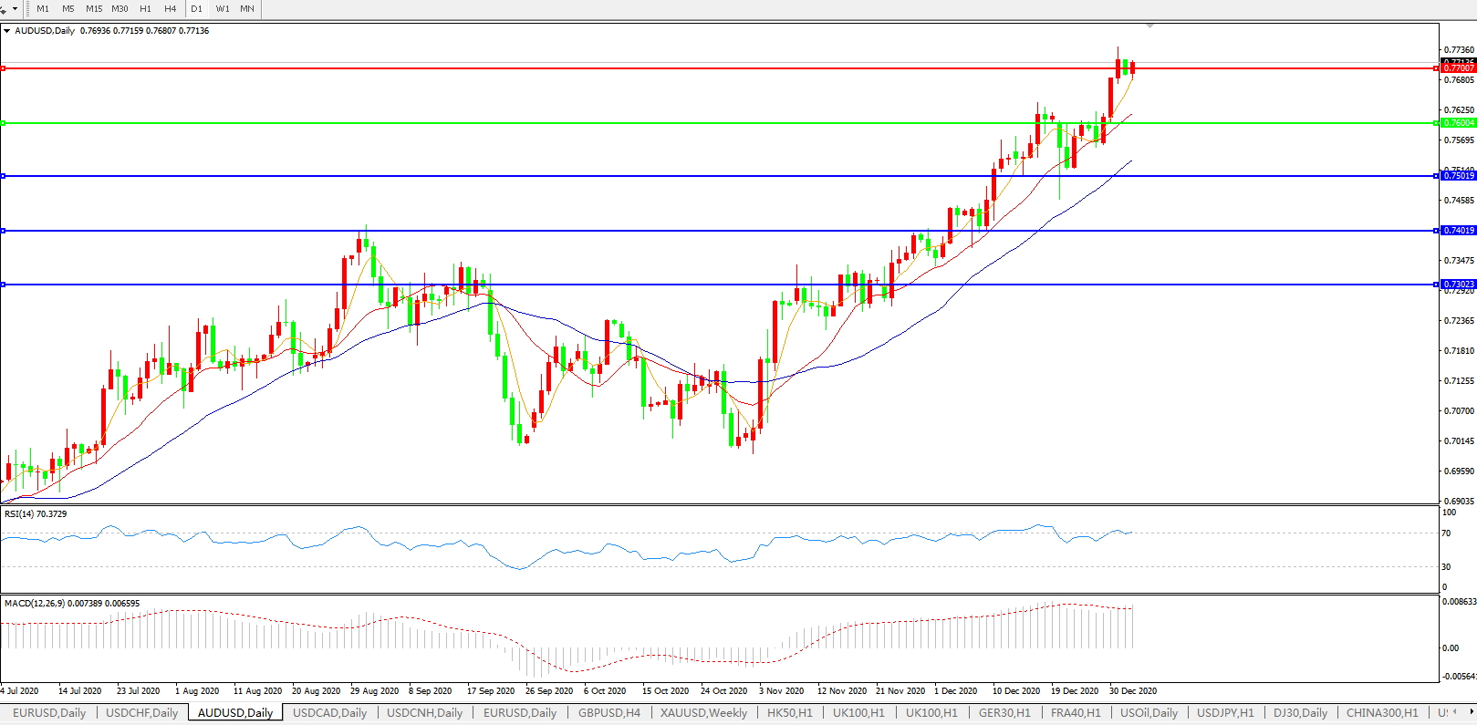 交易策略:0.7600上方看涨,目标0.7700、0.7800