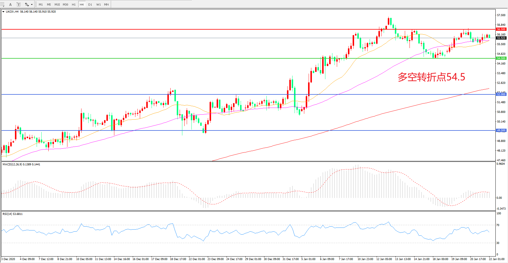 交易策略: 在54.50之上看涨,目标56.50 60.00