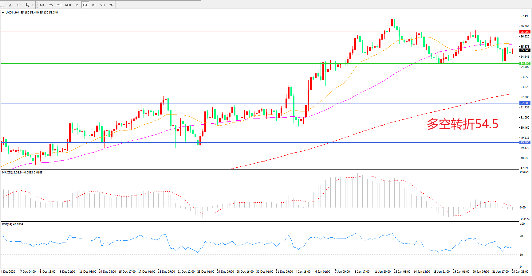 交易策略: 在54.50之上看涨,目标56.50 60.00