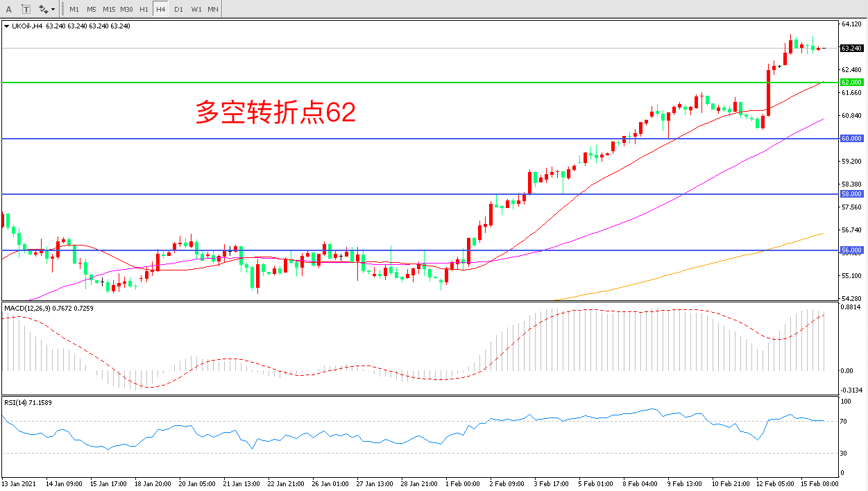 交易策略:  在62.00之上看涨,目标65.00             68.00