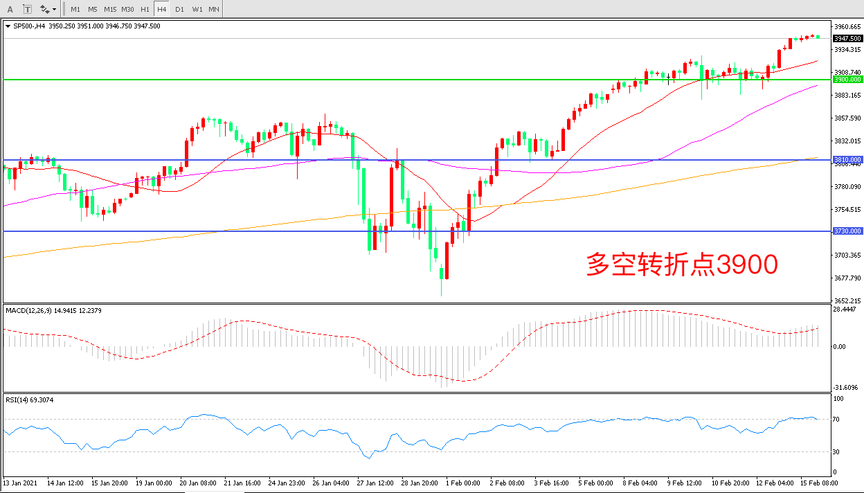 周一(2月15日)美国的华盛顿诞辰纪念日,美国股市和休市一天周二开盘,标普500小幅上行,截至发稿前收报3947.00点。目前新冠疫苗在全球主要国家成功推出和美国即将出炉新一轮大规模财政刺激,提高了人们对经济复苏的预期,风险情绪的高涨推高了市场对于股市的信心。