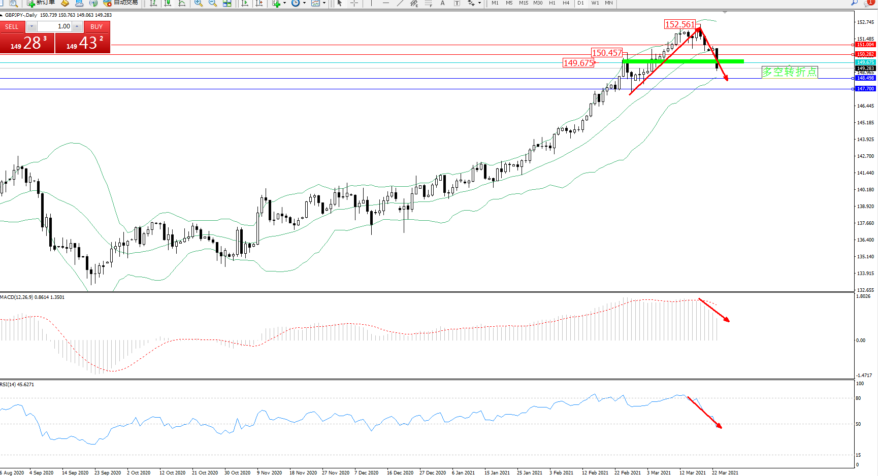 技术点评:多头动力延续布林带指标通道中上轨区间持续震荡上移,高位抵达152.561位置节点后遇阻回撤,处于中下轨区间持续震荡向下移动中,布林带指标呈收口走势中,MACD指标处于多头区域维持整理缓慢下移,RSI指标高位持续下行至50均衡线附近震荡后有继续下行迹象;