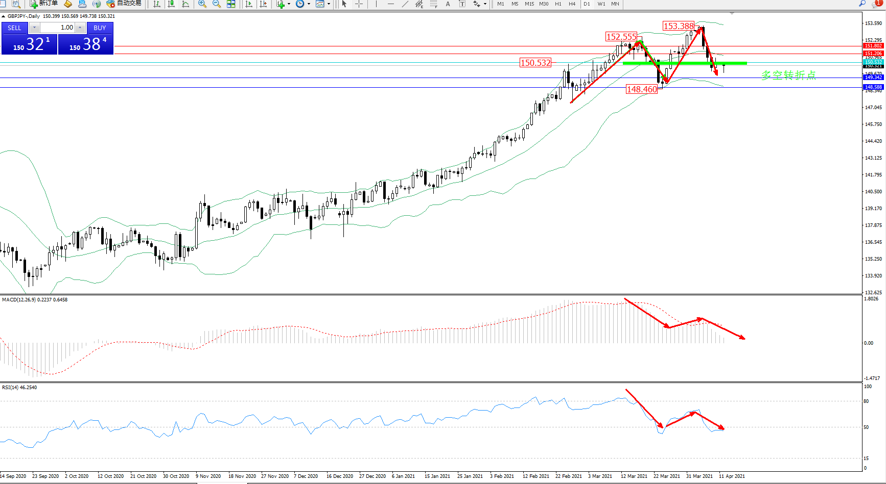 交易策略:150.532下方看跌,目标149.342、148.588