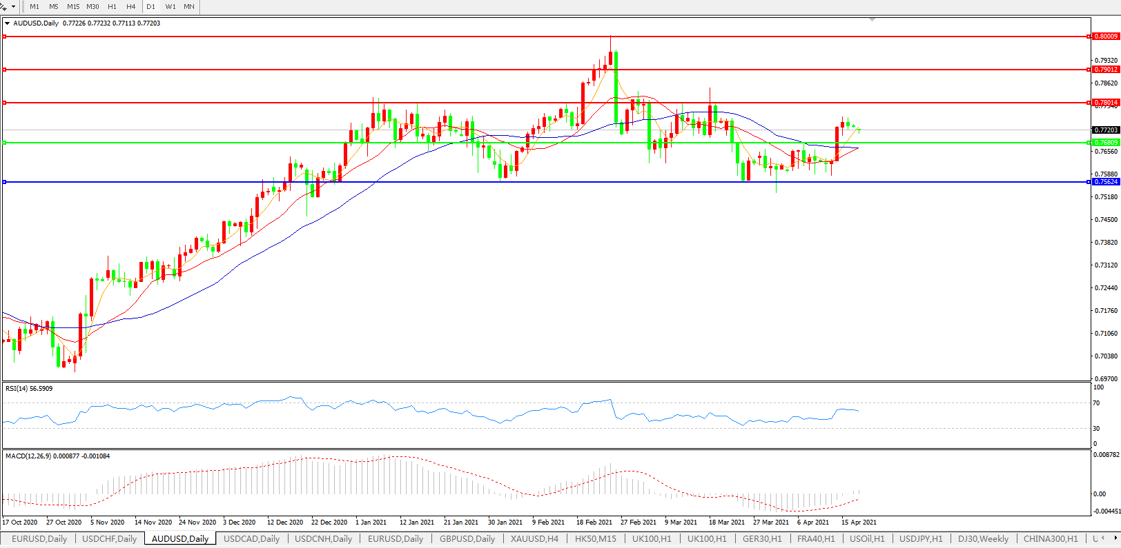 备选策略:0.7680下方看跌,目标0.7560、0.7400