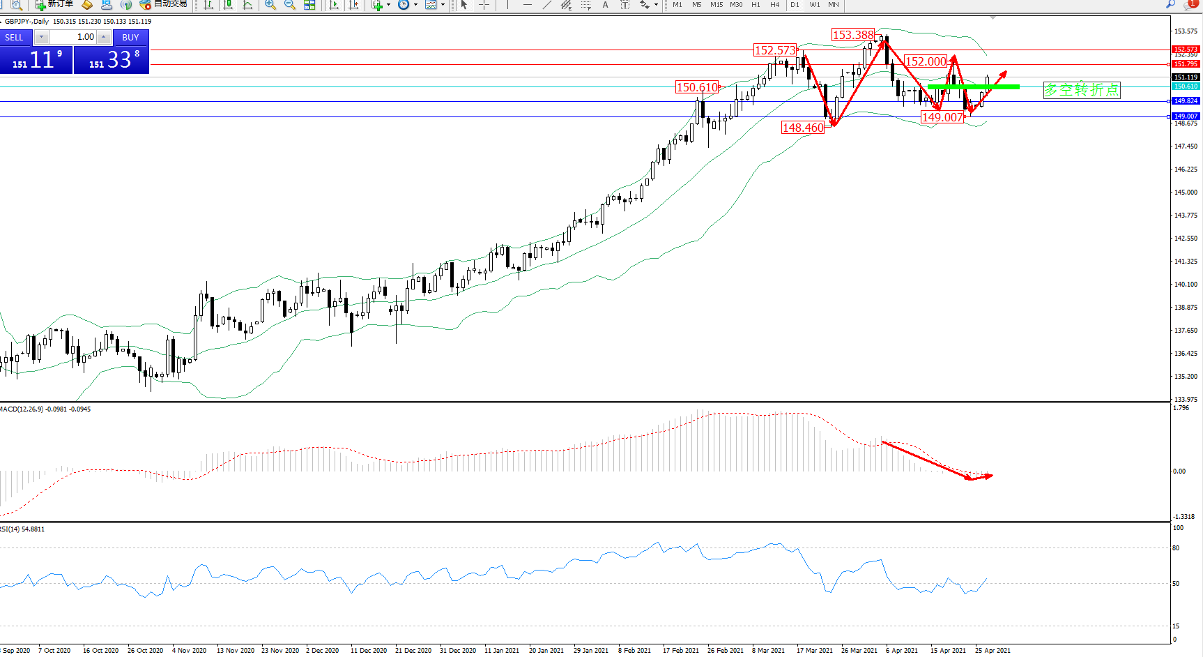 技术点评:多头动力延续布林带指标通道持续震荡上扬,高位触及153.388位置后震荡回撤下行,纠结于中下轨区间弱势整理平移,抵达149.007位置后多头动力震荡回升,突破中轨进入中上轨区间震荡,布林带指标呈收口走势中,MACD指标高位空头动力震荡下行至0轴线附近节点开始徘徊,RSI指标纠结于50均衡线下方弱势整理后回升;