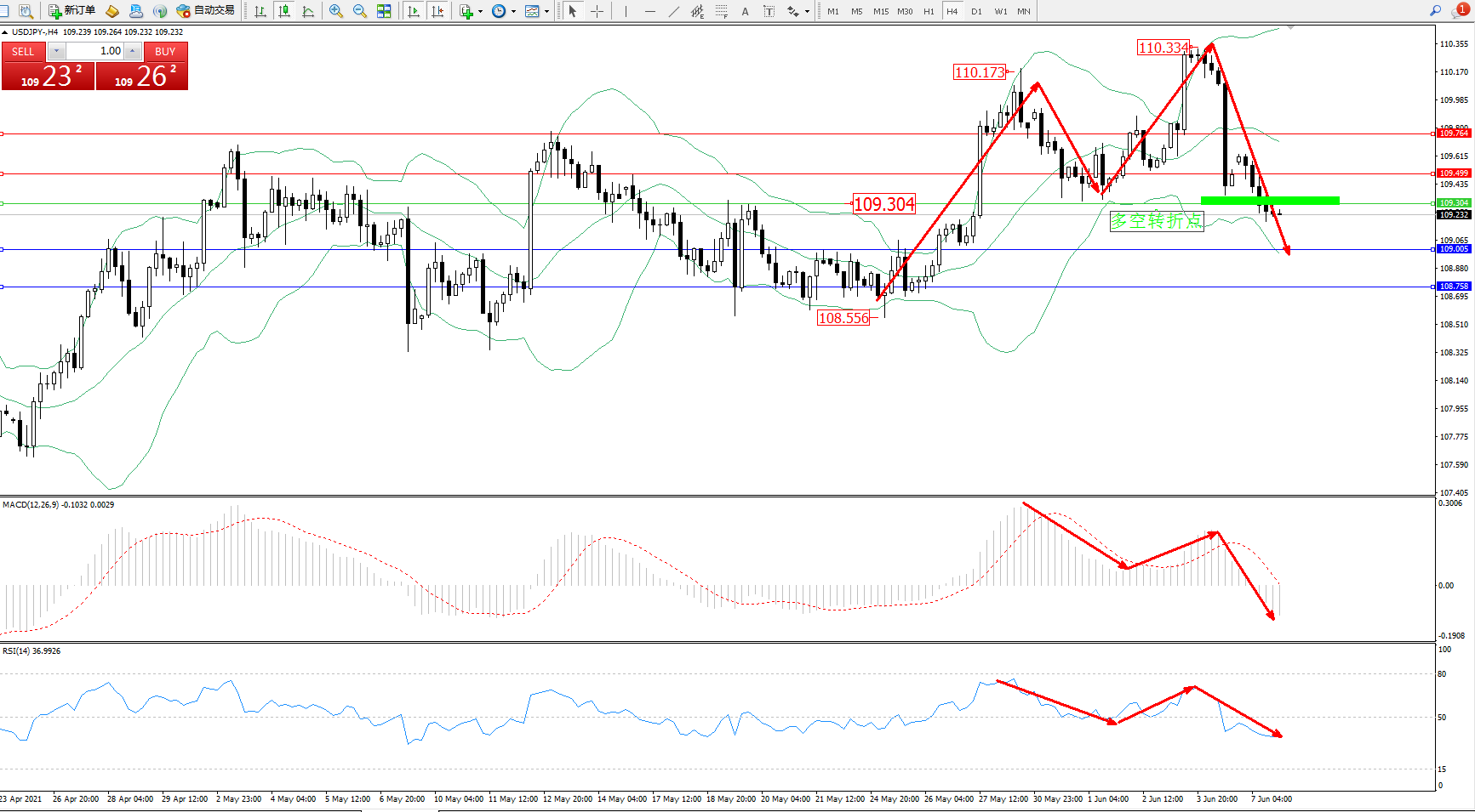 交易策略:109.304下方看跌,目标109.005、108.758
