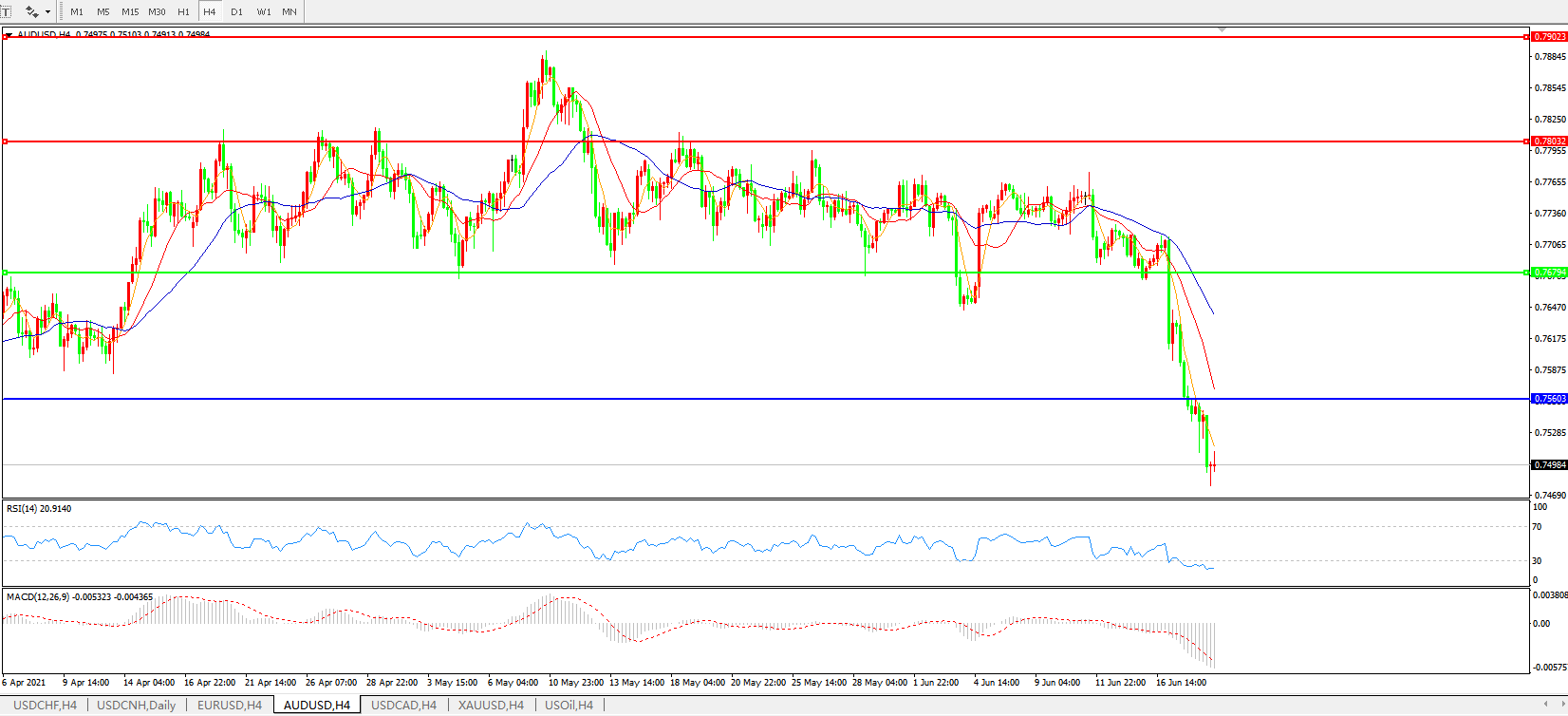 技术面简析:4小时图均线发散下行,汇价持续走低,MACD运行于0轴下方且量能持续放量,RSI持续走弱,预计汇价大概率将进一步下行。