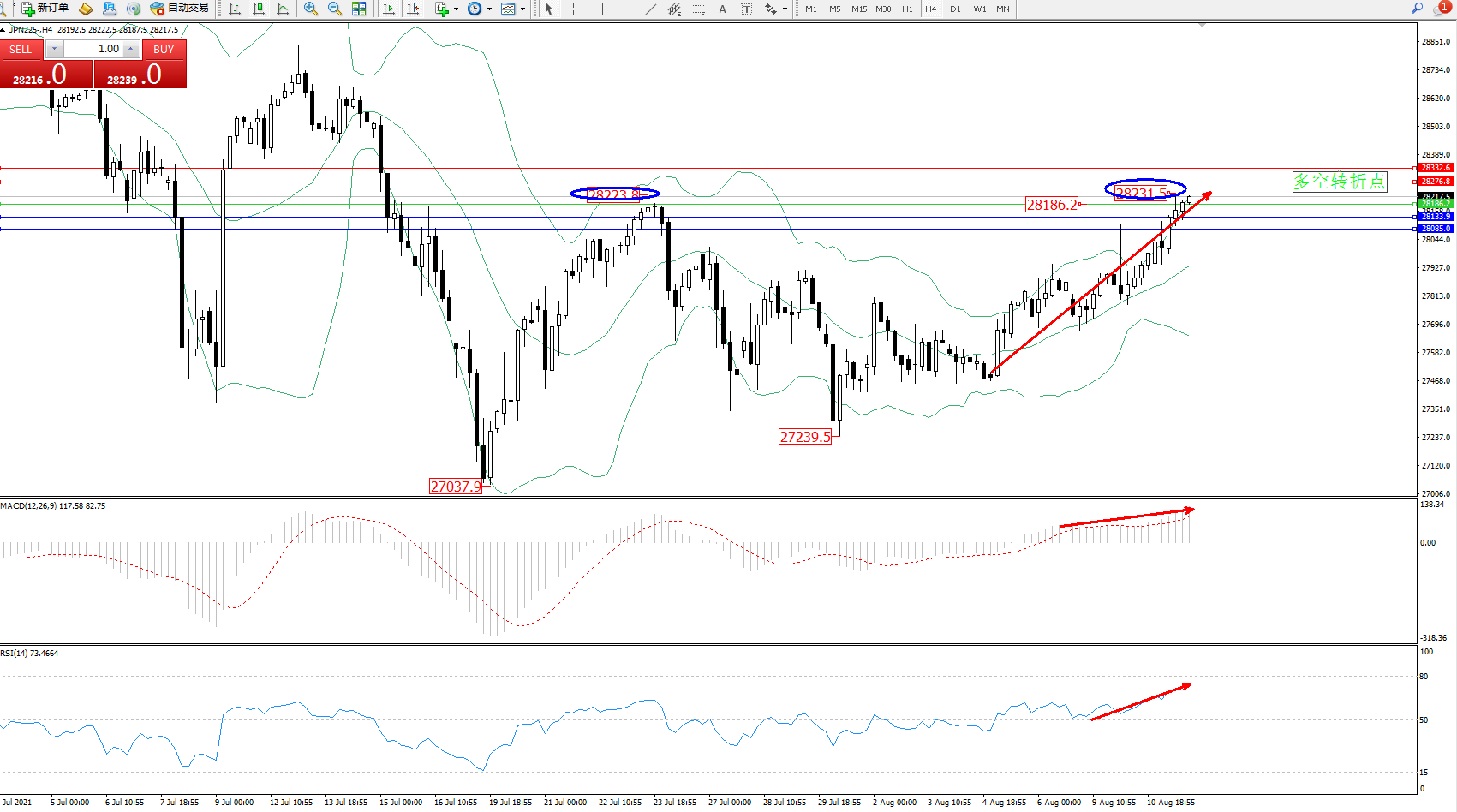 日经指数JPN225——4小时K线图显示: