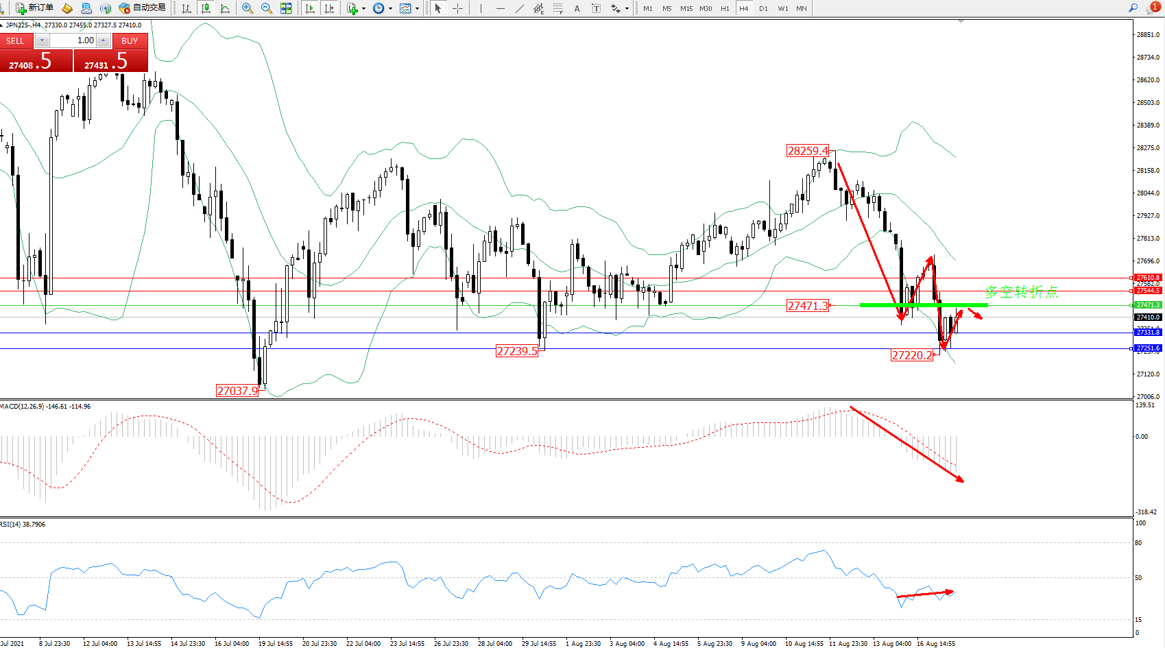 日经指数JPN225——4小时K线图显示:
