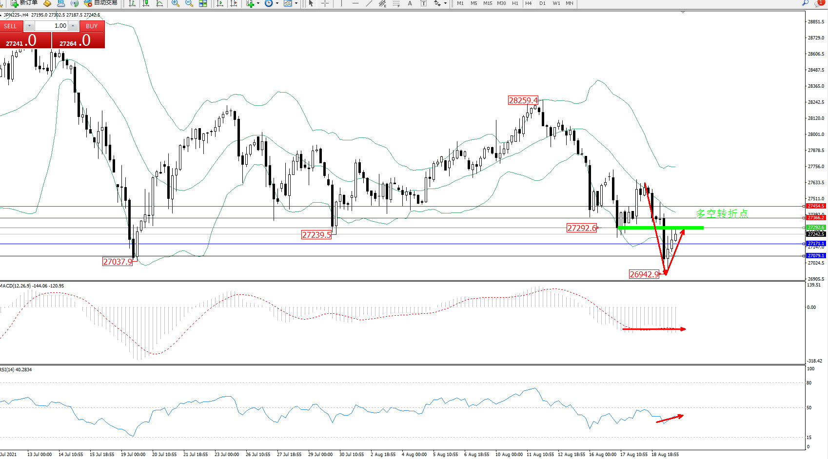 日经指数JPN225——4小时K线图显示: