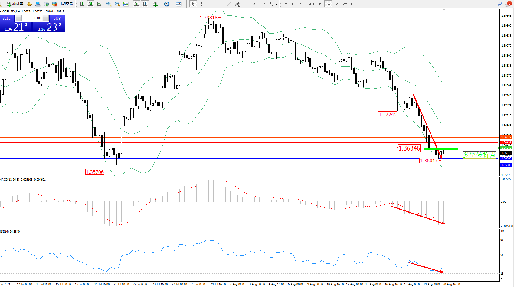 交易策略:1.36346下方看跌,目标1.36065、1.35889