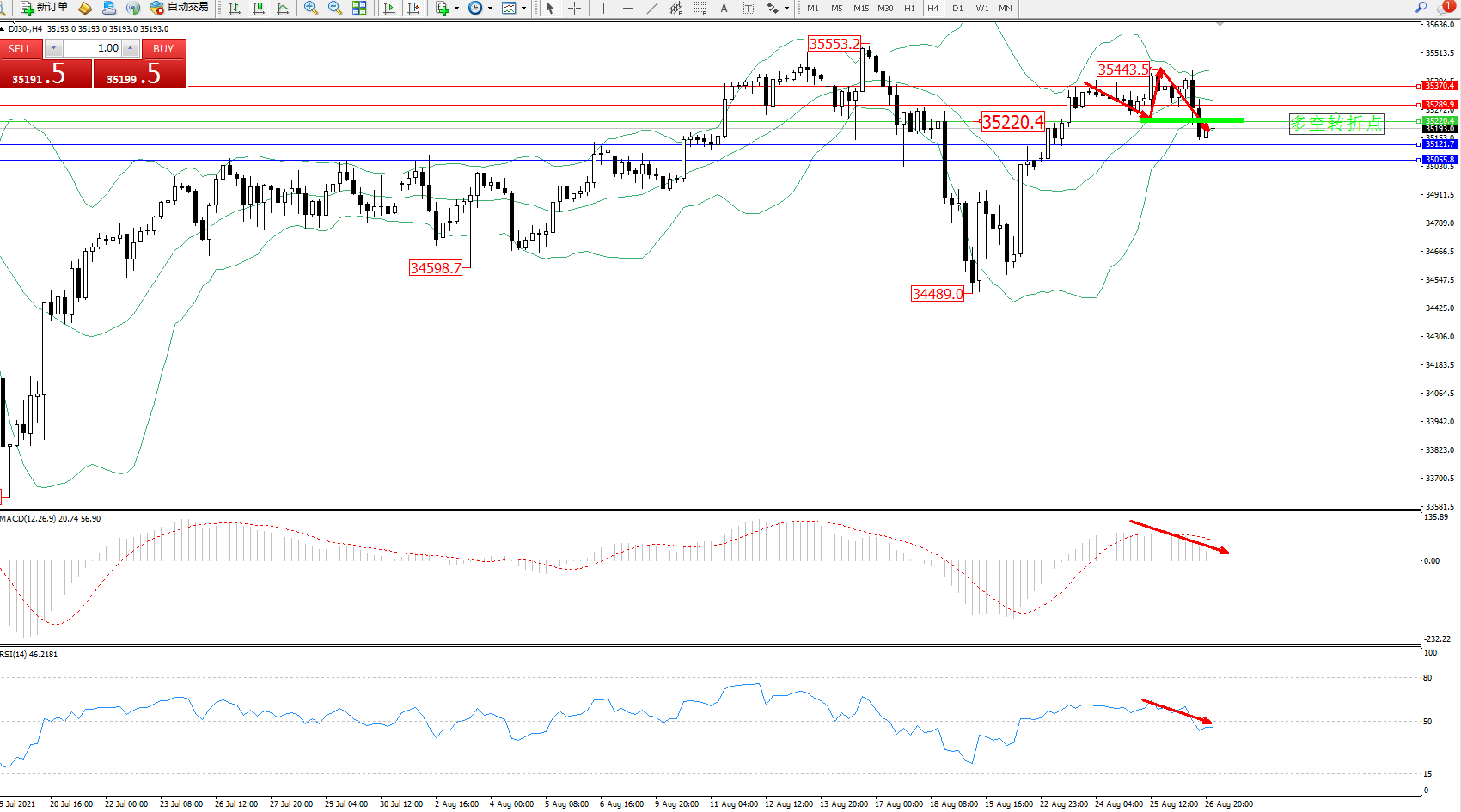 道琼斯指数DJ30——4小时K线图显示: