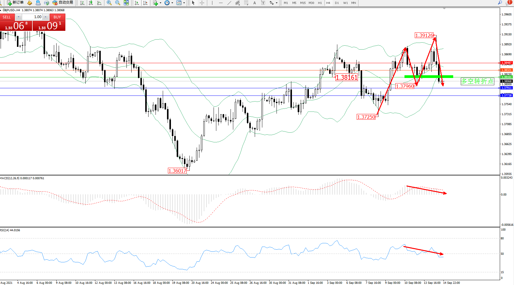 交易策略:1.38161下方看跌,目标1.37911、1.37738