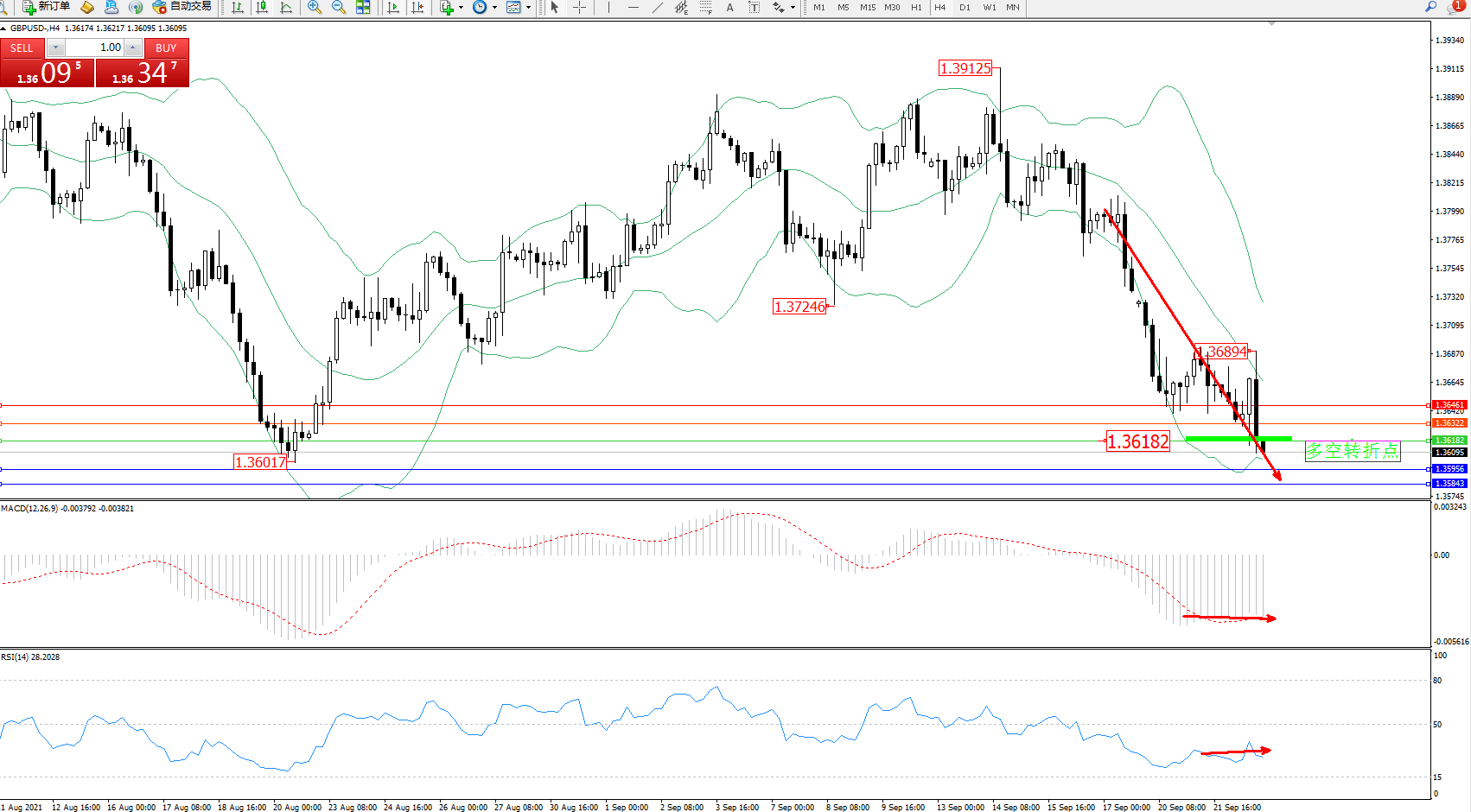 交易策略:1.36182下方看跌,目标1.35956、1.35843