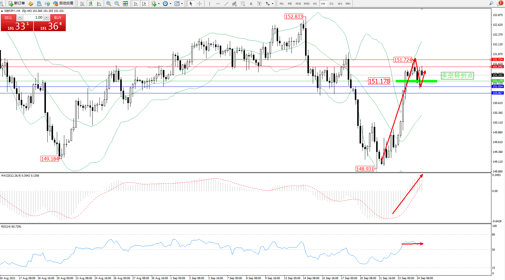 交易策略:151.178上方看涨,目标151.542、151.724
