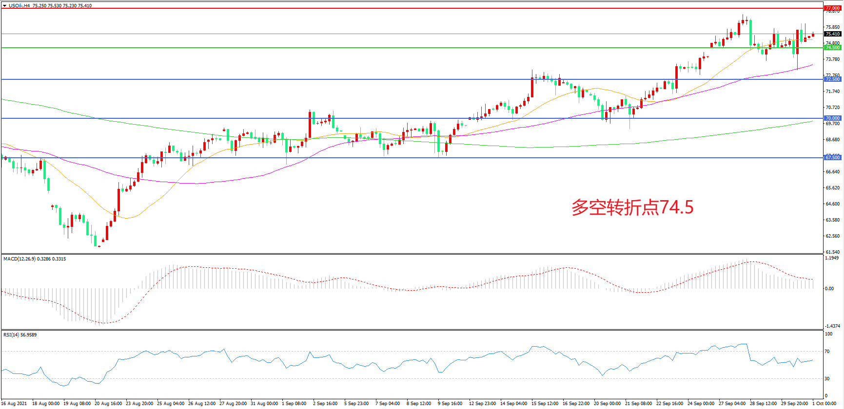 4小时图看,油价回踩55周期均线后再度拉升,短期表现较强,74.5美元成为短期多空分水岭,均线系统呈多头排列,MACD红柱增加,RSI指标走平,日内延续上行概率较大。