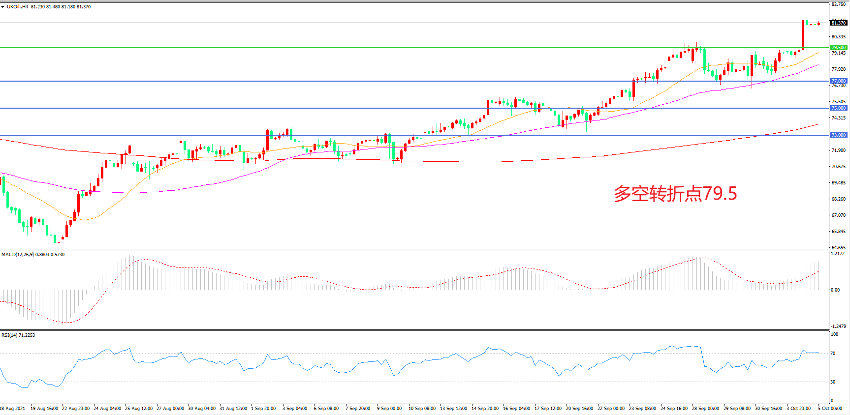 4小时图看,油价回踩21周期均线后长阳拉升,短期表现较强,79.5美元成为短期多空分水岭,MACD红柱增加,RSI指标走平,日内延续上行概率较大。