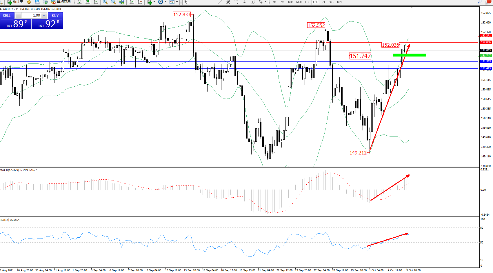 交易策略:151.747上方看涨,目标152.096、152.271