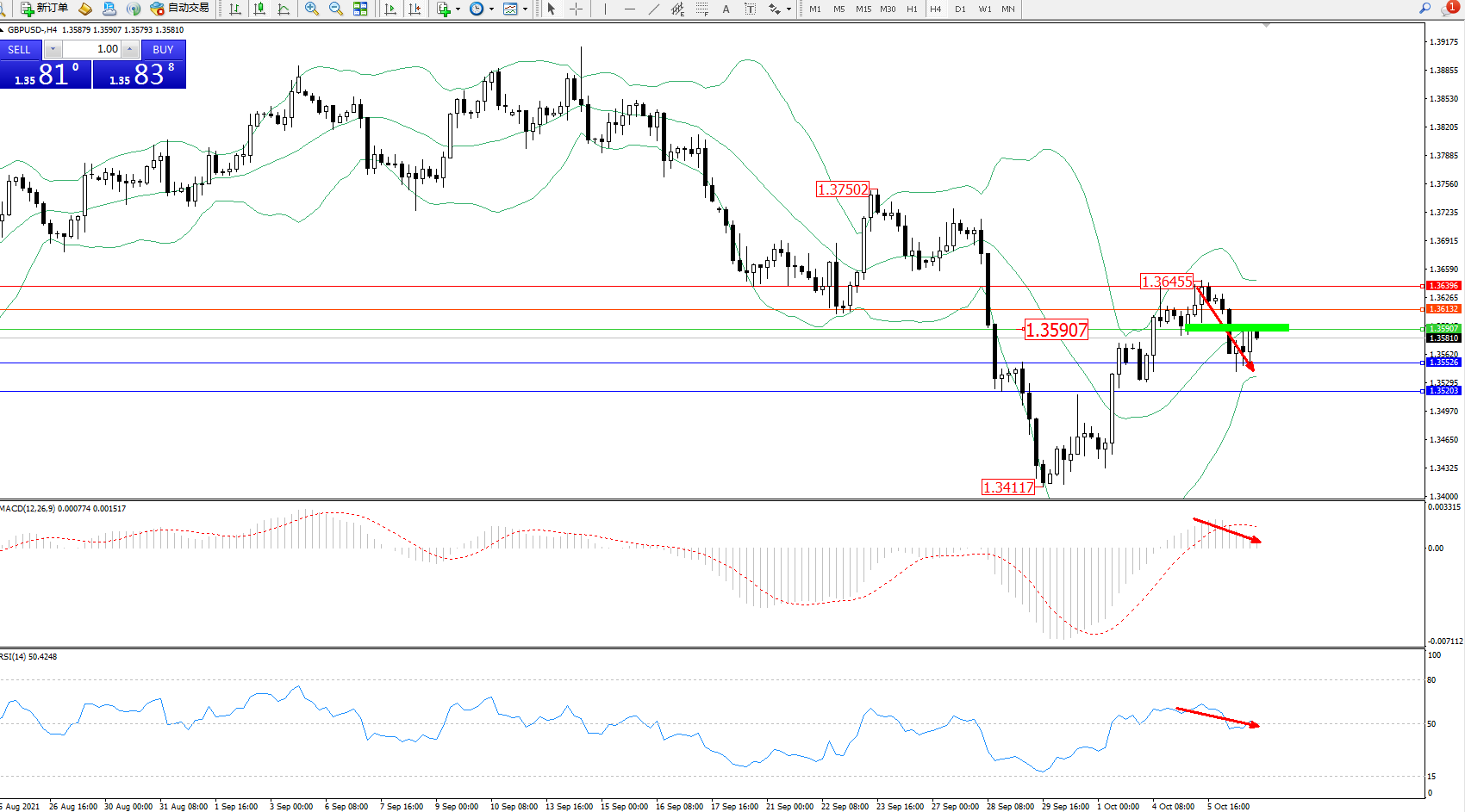 交易策略:1.35907下方看跌,目标1.35526、1.35203