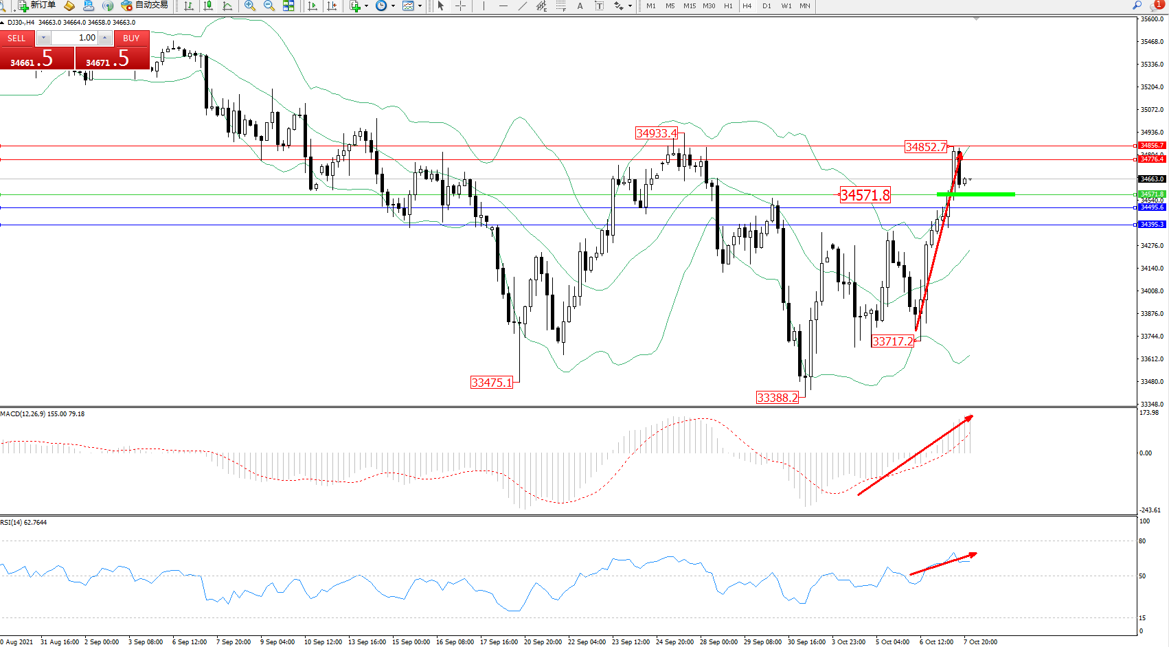 交易策略:34571上方看涨,目标34776、34856