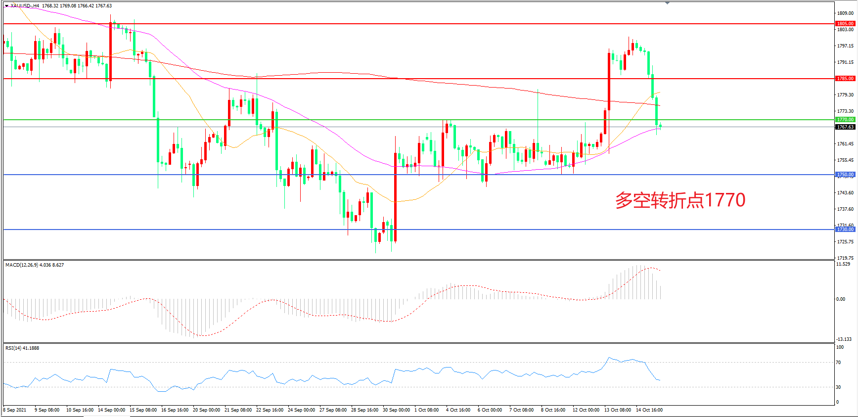 4小时图看,金价短期调整后破位下行,上行趋势遭到破坏,1785成为短期多空分水岭,55均线成为下方支撑,MACD红柱缩短,RSI指标向下,日内延续弱势概率较大。