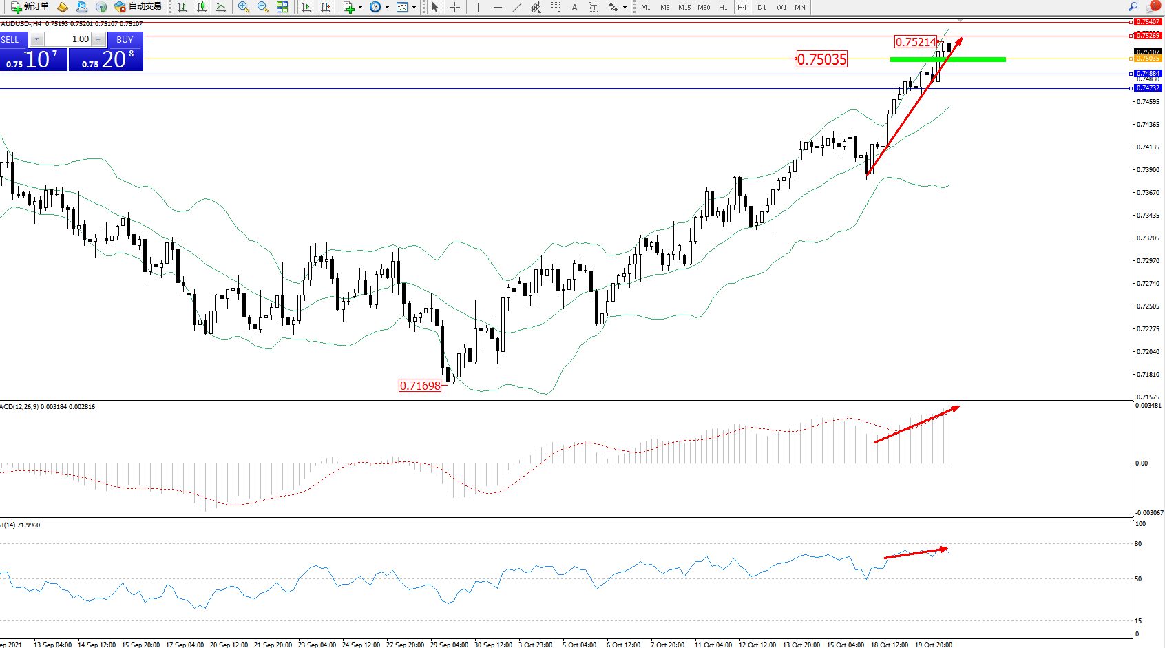 技术点评:多头动力延续布林带指标通道上轨附近持续震荡上扬,高位抵达0.75214位置节点后开始不断攀升中,短期多头动力有进一步向上移动,布林带指标呈张口走势持续,MACD指标处于多头区域不断向上拉升,RSI指标处于多头区域高位持续整理平移;