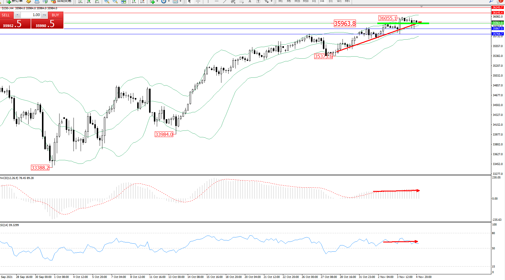 道琼斯指数DJ30——4小时K线图显示: