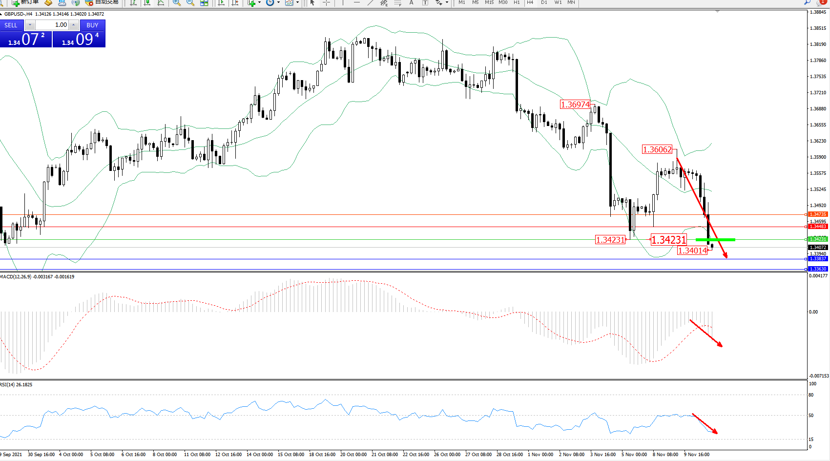 交易策略:1.34231下方看跌,目标1.33837、1.33630